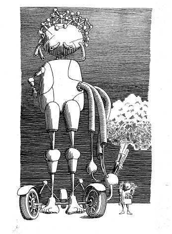 They fell into despair, and they didn’t even know what to think because this had never happened to them before, so they mobilized and analyzed, made nets and glues, lariats and screws, traps and contraptions to make it drown, break it down, make it fall, or maybe wall it up—they try this way and that and the other, but one is as poor as another. They turn everything upside-down, but nothing helps. They’re about ready to give up hope when suddenly they see—someone’s coming: he’s on horseback, but no, horses don’t have wheels—it must be a bicycle, but wait, bicycles don’t have prows, so maybe it’s a rocket, but rockets don’t have saddles. What he’s riding no one can tell, but who’s in the saddle we all know well: it’s Trurl himself, the constructor, out on a spree, or maybe on one of his famous sallies, serene and smiling, coming closer, flying by—but even from a distance you’d know that this wasn’t just anybody.