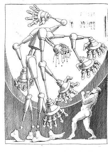 As I stood there, two men approached. One looked me straight in the eye as he swung and smote the other full force in the nose. I stared in amazement, neither grabbing my own nose nor shouting with pain, since, as a robot, I could not feel the blow, and that proved my undoing, for these were secret police and they had employed this ruse precisely to unmask me. Handcuffed and hauled off to jail, I confessed everything, trusting that they would take into consideration my good intentions, though half the city now lay in ashes. But first they pinched me cautiously with pincers, and then, fully satisfied it produced no ill effects whatever on themselves, jumped upon me and began most savagely to batter and break every plate and filament in my weary frame. Ah, the torments I endured, and all because I wished to make them happy! At long last, what remained of me was stuffed down a cannon and shot into cosmic space, as dark and serene as always. In flight I looked back and saw, albeit in a fractured fashion, the spreading influence of Altruizine—spreading, since the rivers and streams were carrying the drug farther and farther. I saw what happened to the birds of the forest, the monks, goats, knights, villagers and their wives, roosters, maidens and matrons, and the sight made my last tubes crack for woe, and in this state did I finally fall, O kind and noble sir, not far from your abode, cured once and for all of my desire to render others happy by revolutionary means…