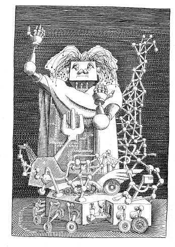 Next Trurl began to model Civilization, the striking of fires with flints and the tanning of hides, and he provided for dinosaurs and floods, bipedality and taillessness, then made the paleopaleface (Albuminidis sapienria), which begat the paleface, which begat the gadget, and so it went, from eon to millennium, in the endless hum of electrical currents and eddies. Often the machine turned out to be too small for the computer simulation of a new epoch, and Trurl would have to tack on an auxiliary unit—until he ended up, at last, with a veritable metropolis of tubes and terminals, circuits and shunts, all so tangled and involved that the devil himself couldn’t have made head or tail of it. But Trurl managed somehow, he only had to go back twice —once, almost to the beginning, when he discovered that Abel had murdered Cain and not Cain Abel (the result, apparently, of a defective fuse), and once, only three hundred million years back to the middle of the Mesozoic, when after going from fish to amphibian to reptile to mammal, something odd took place among the primates and instead of great apes he came out with gray drapes. A fly, it seems, had gotten into the machine and shorted out the polyphase step-down directional widget. Otherwise everything went like a dream. Antiquity and the Middle Ages were recreated, then the period of revolutions and reforms —which gave the machine a few nasty jolts—and then civilization progressed in such leaps and bounds that Trurl had to hose down the coils and cores repeatedly to keep them from overheating.